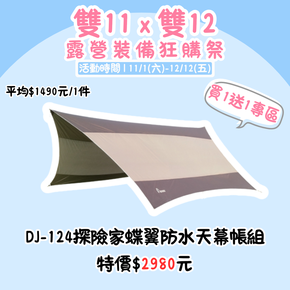 雙11X雙12,露營裝備狂購季 | DJ-124 探險家蝶翼防水天幕帳組 買一送一『活動時間:𝟭𝟭/𝟬𝟭-𝟭𝟮/𝟭𝟮』