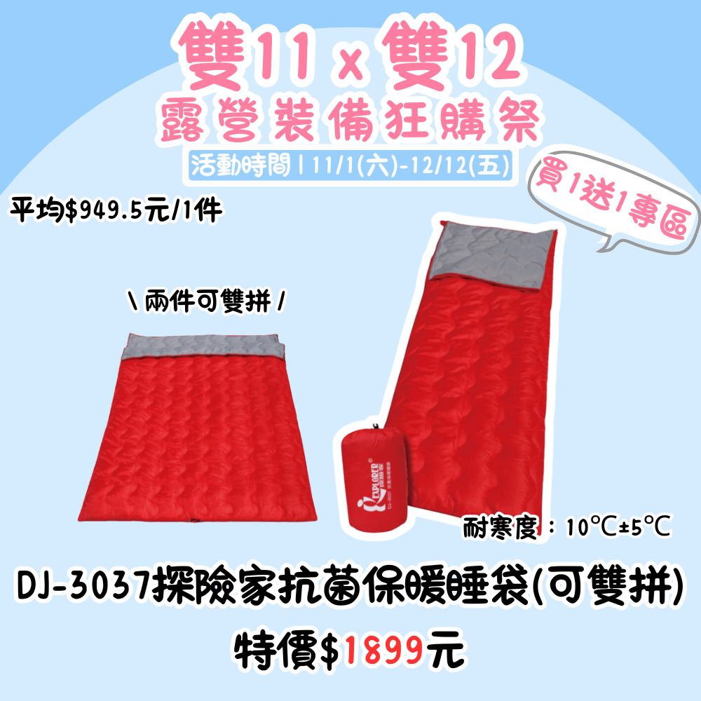 雙11X雙12,露營裝備狂購季 | DJ-3037 探險家抗菌保暖睡袋 (可雙拼) 買一送一『活動時間:𝟭𝟭/𝟬𝟭-𝟭𝟮/𝟭𝟮』