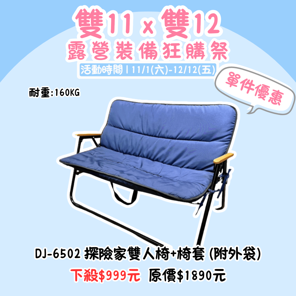 雙11X雙12,露營裝備狂購季 | DJ-6502 探險家雙人椅+椅套 單品下殺優惠『活動時間:𝟭𝟭/𝟬𝟭-𝟭𝟮/𝟭𝟮』