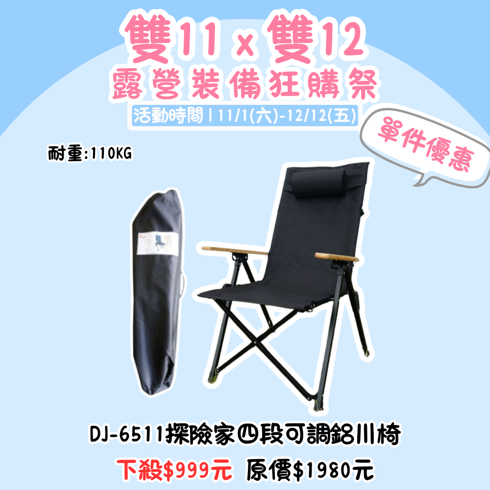 雙11X雙12,露營裝備狂購季 | DJ-6511探險家四段可調鋁川椅 單品優惠價『活動時間:𝟭𝟭/𝟬𝟭-𝟭𝟮/𝟭𝟮』