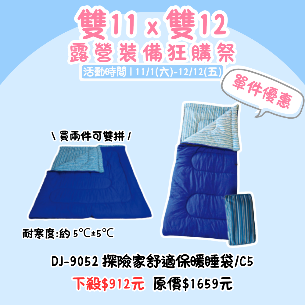 雙11X雙12,露營裝備狂購季 | DJ-9052 探險家舒適保暖睡袋/C5 單品優惠價『活動時間:𝟭𝟭/𝟬𝟭-𝟭𝟮/𝟭𝟮』
