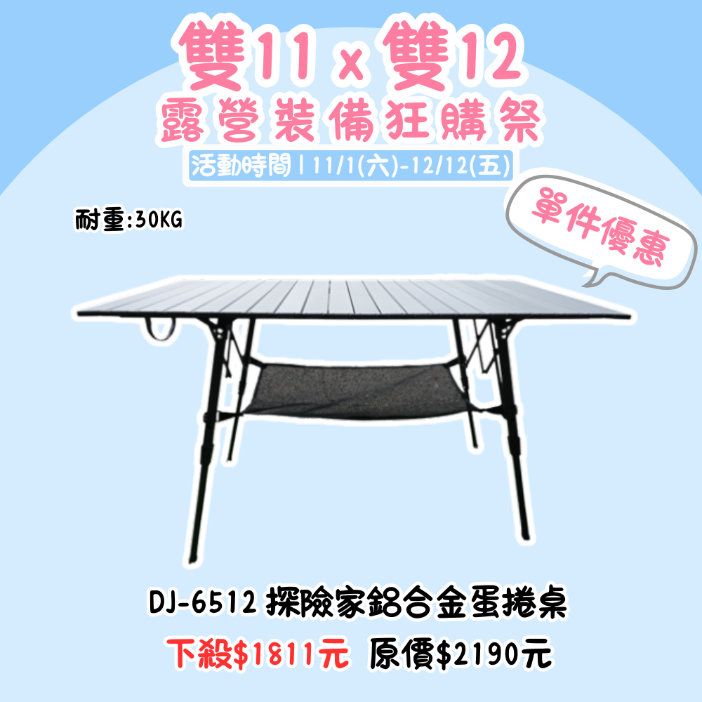 雙11X雙12,露營裝備狂購季 | DJ-6512 探險家鋁合金蛋捲桌 單品優惠價『活動時間:𝟭𝟭/𝟬𝟭-𝟭𝟮/𝟭𝟮』