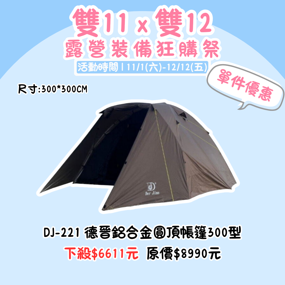 雙11X雙12,露營裝備狂購季 | DJ-221鋁合金圓頂帳篷300型 單品優惠價『活動時間:𝟭𝟭/𝟬𝟭-𝟭𝟮/𝟭𝟮』