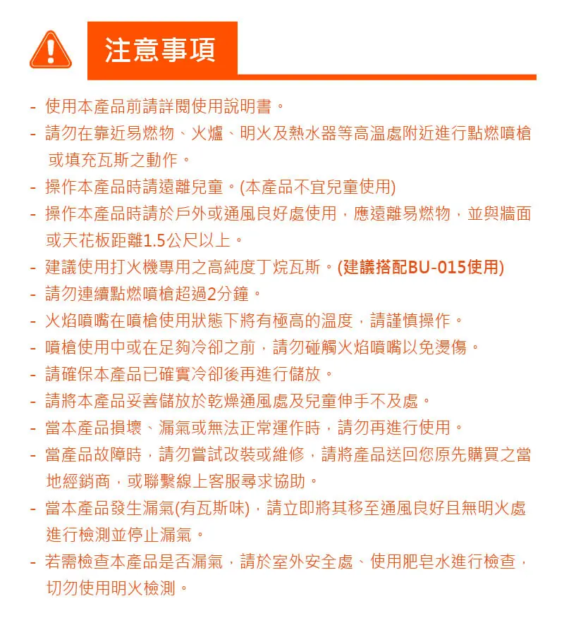 本產品使用高壓易燃氣體丁烷,請謹慎操作 禁止在攝氏45°C(華氏113°F)以上環境操作或儲放 臉部及身體請務必與產品保持適當安全距離 請遠離火源及易燃物,並存放置陰涼處及孩童無法取得的地方 禁止長時間曝曬在陽光下直接照射 使用中 / 完畢後,請勿觸碰火焰噴嘴,以免燙傷 ▶ 商品顏色以實際出貨為主。 ▶ 因電腦色差問題,商品顏色請以實際商品為主。 ▶ 本店商品均與實體店面同步販售,庫存流動大,下單前請務必詢問是否有現貨。 ▶ 全館滿699免運,偏遠地區另計。