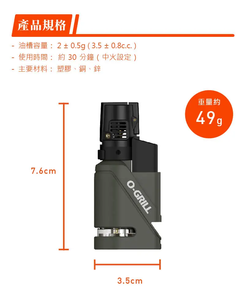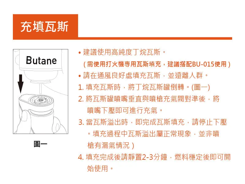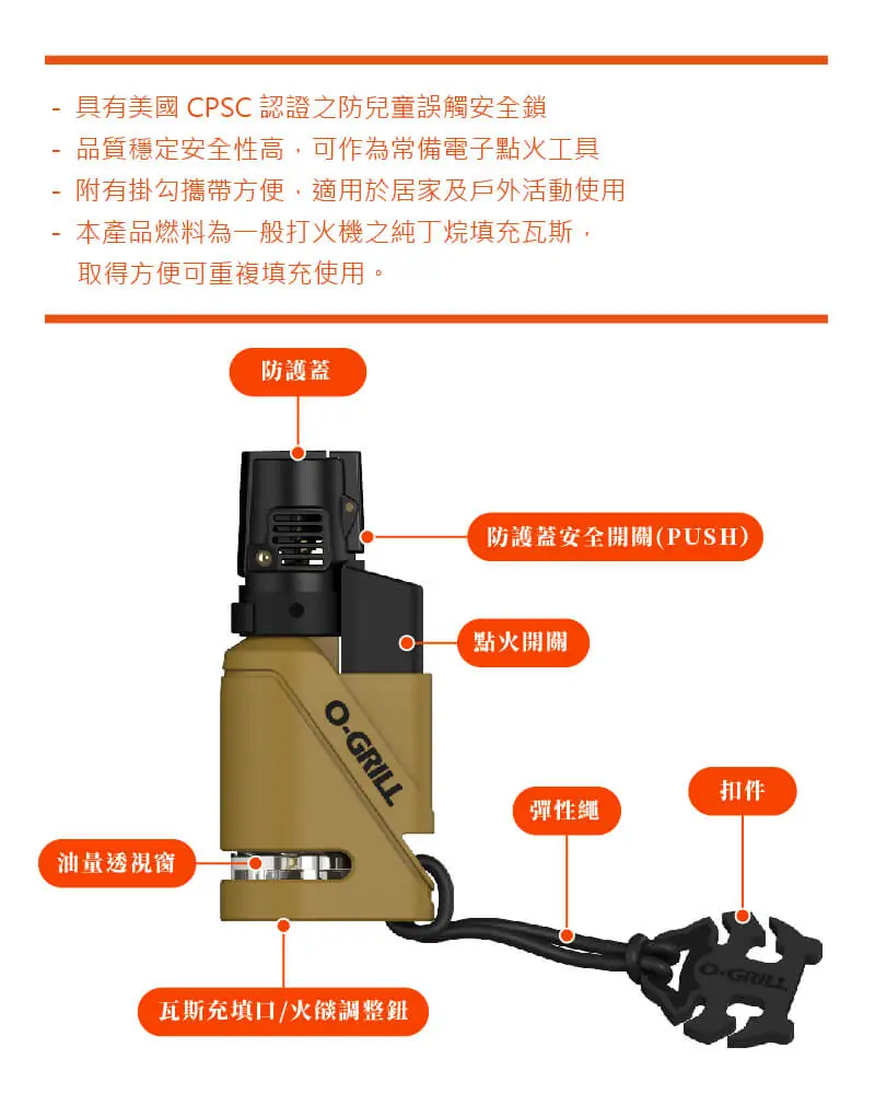 ◍ 可調整式火焰,可填充重複使用(需使用打火機填充專用瓦斯)。