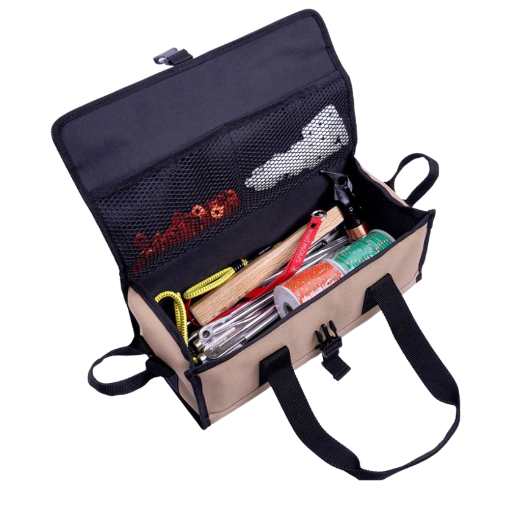 ◍ 萬用帆布工具袋可收納各式營釘、營槌、營繩、防雷帽、餐具、S掛勾、調節拉繩、調節片、燈勾、餐具廚具刀具、碗筷、料理剪刀、 瓦斯等用具。