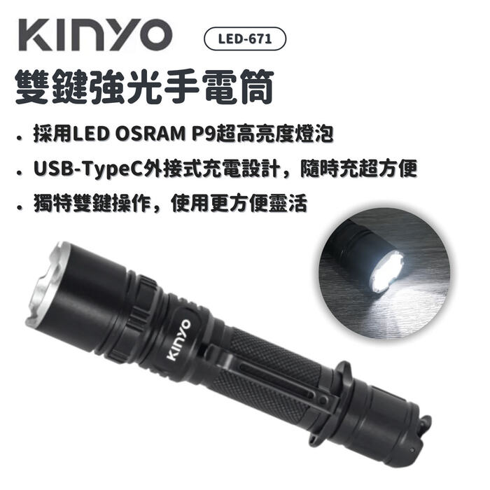 · 商品名稱:KINYO | LED-671 雙鍵強光手電筒